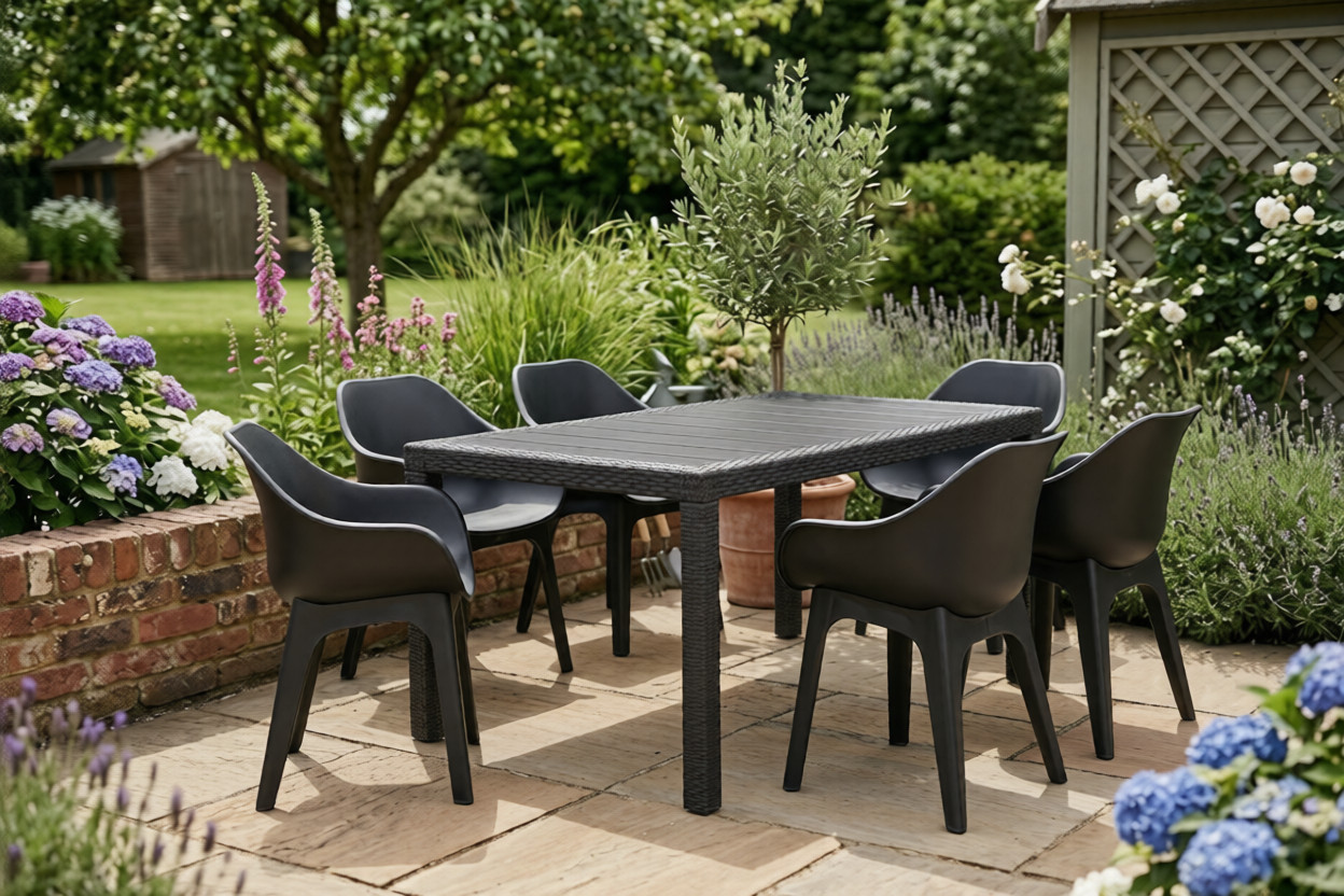 Stół i krzesła są idealnie przystosowane do warunków atmosferycznych. Dzięki poszerzonemu zestawieniu mebli, można organizować wspólne posiłki i wielkie przyjęcia. Prosta bryła krzesła i stołu sprawiają, że staje się uniwersalne do każdego typu wnętrza ogrodowego. Wytrzymały materiał polipropylenowy pozwala bez wątpienia zakwalifikować je do produktów najwyższej jakości.